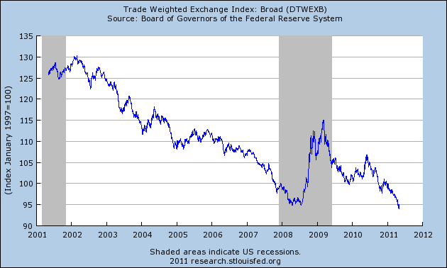 The weaker dollar foreign exchange price transmits commodity inflation to the U.S., which is why the oil price today is above $100 per barrel. Oil companies should stress this point every time they get called out for high prices and profits.