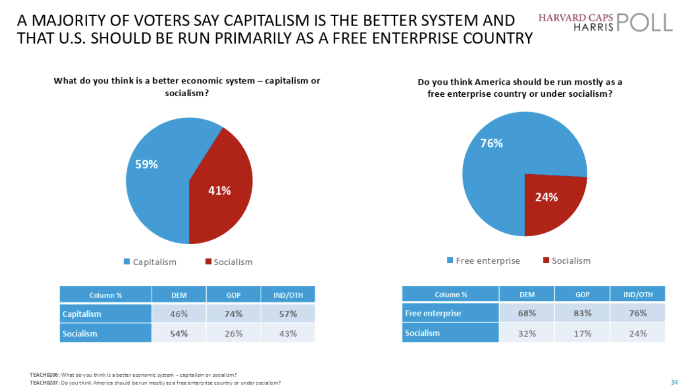 We’ve been making this point for ages, but this truism came shining through again in the latest Harris Poll. When voters are asked whether they support capitalism or socialism, capitalism wins – but not by much.