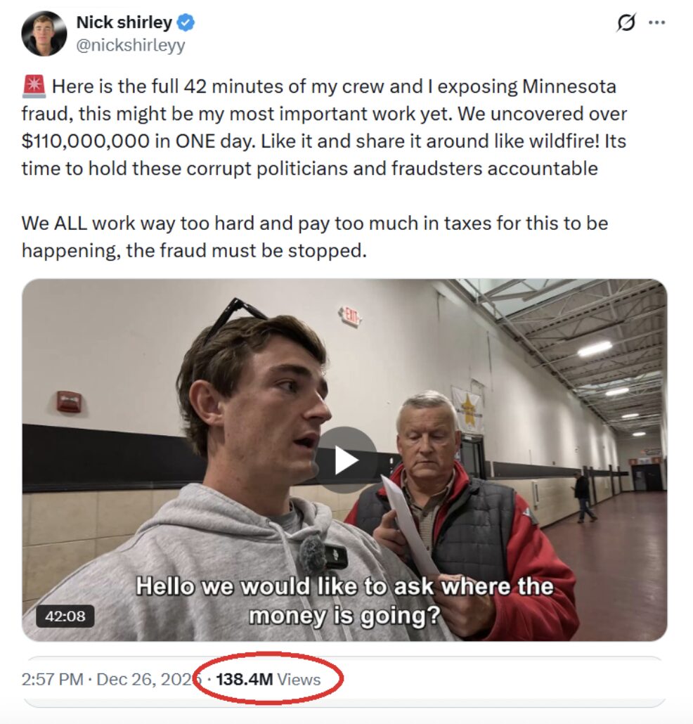 Walz knew the jig was up when last month, Nick Shirley, a 23-year-old citizen journalist, posted a video of empty state-funded “daycare centers” run by Somali immigrants across Minnesota. The video has now been viewed over 138 million times on X.