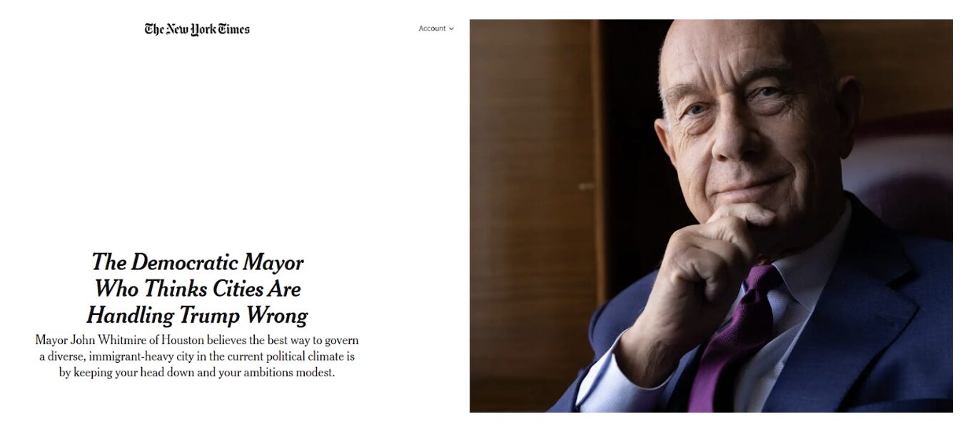 “Most major cities are in turmoil,” Whitmire says. “We’re not.” He faults fellow Democratic mayors Karen Bass of Los Angeles and Brandon Johnson for prioritizing “performance protesting” over the delivery of city services. As for New York’s Mamdani, he bluntly says “He and me are in different universes.”