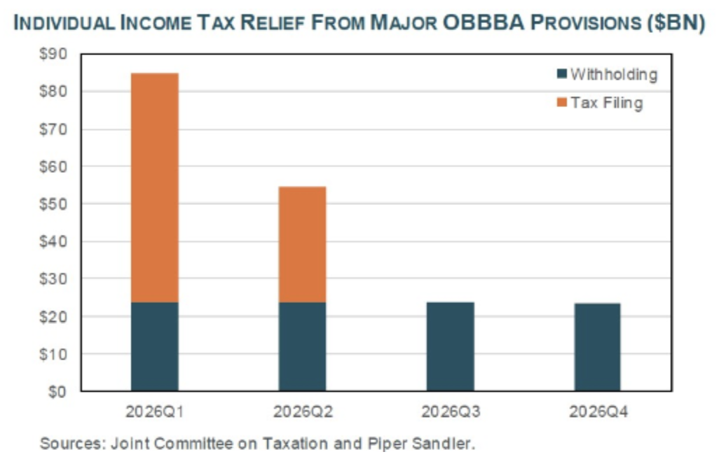 An estimated $190 billion of income tax relief (or about 0.5% of GDP) from the Trump Big Beautiful tax cut arrives in 2026, with most in the first half of the year: