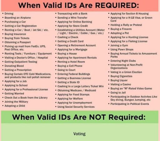 Liberals say that requiring voter ID cards is a form of Jim Crow voter suppression. But this graphic shows that valid photo IDs are ALREADY required for many daily common activities.