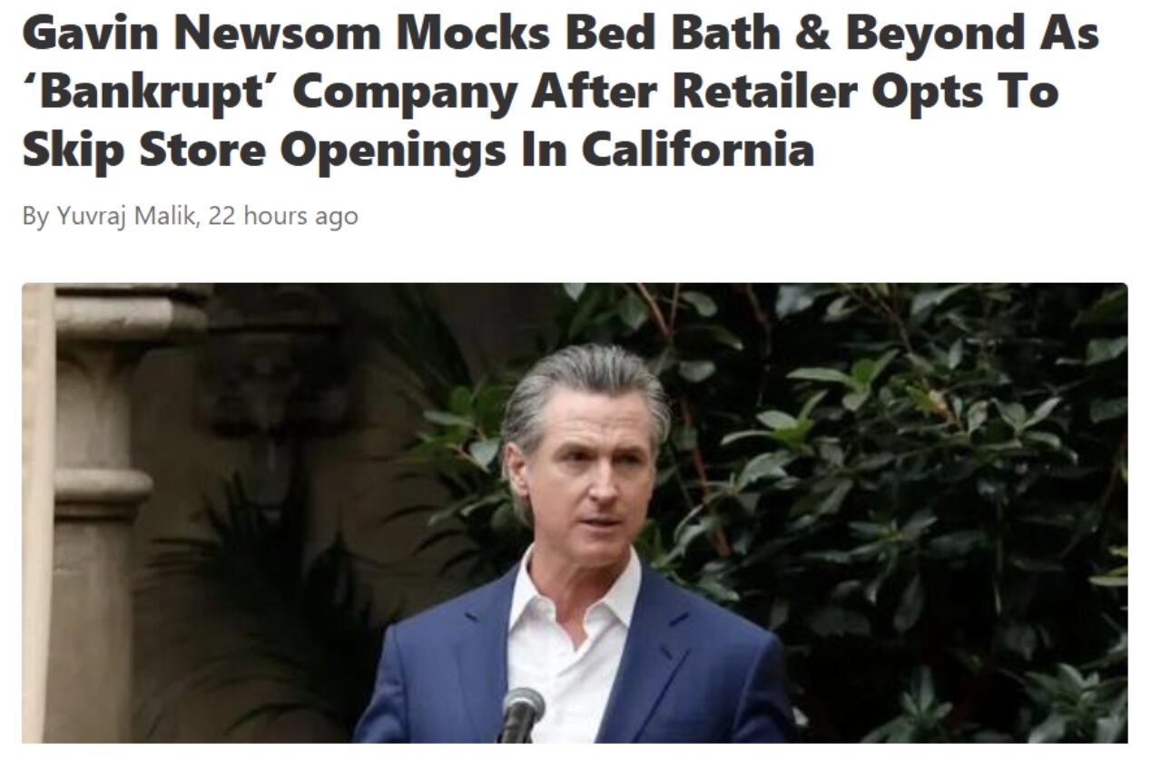When the old big box retailer Bed Bath & Beyond went belly up, its brand assets were acquired by Overstock.com, which renamed itself Bed Bath & Beyond and is now preparing to bring the brand back with retail stores. They plan to be everywhere… except California. The company’s executive chairman Marcus Lemonis says the regulatory and tax environment there just makes it too hard to do business – for which Governor Newsom sarcastically responded: