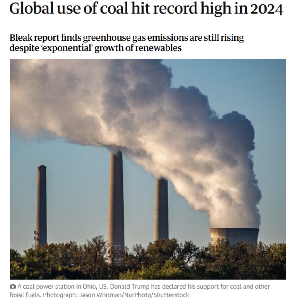 Then there is this headline admission from the Guardian last week about worldwide coal consumption reaching a new all-time high in 2024: