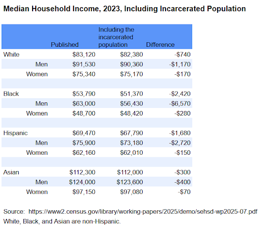 The Census Bureau recently published a working paper that includes median household income estimates (for 2023 – not the 2024 numbers we used yesterday) with prisoners included. The effect widens the racial gap, especially for males. The black male median income falls from $63,000 to closer to $56,400 – a loss of $6,400.