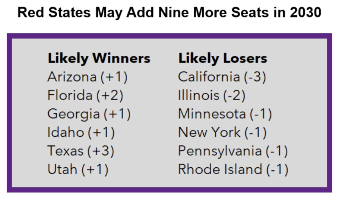 Red states are likely to gain NINE more electoral votes and House seats after the 2030 Census if present population trends continue.
