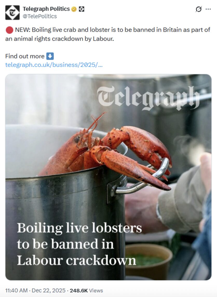 As the British economy continues to wallow in the muck of slow growth and free speech has been thrown out the window, the ruling Labour Party has made it a top priority to prohibit boiling live lobsters. Is killing a lobster before boiling it somehow more humane? We don’t quite get it.