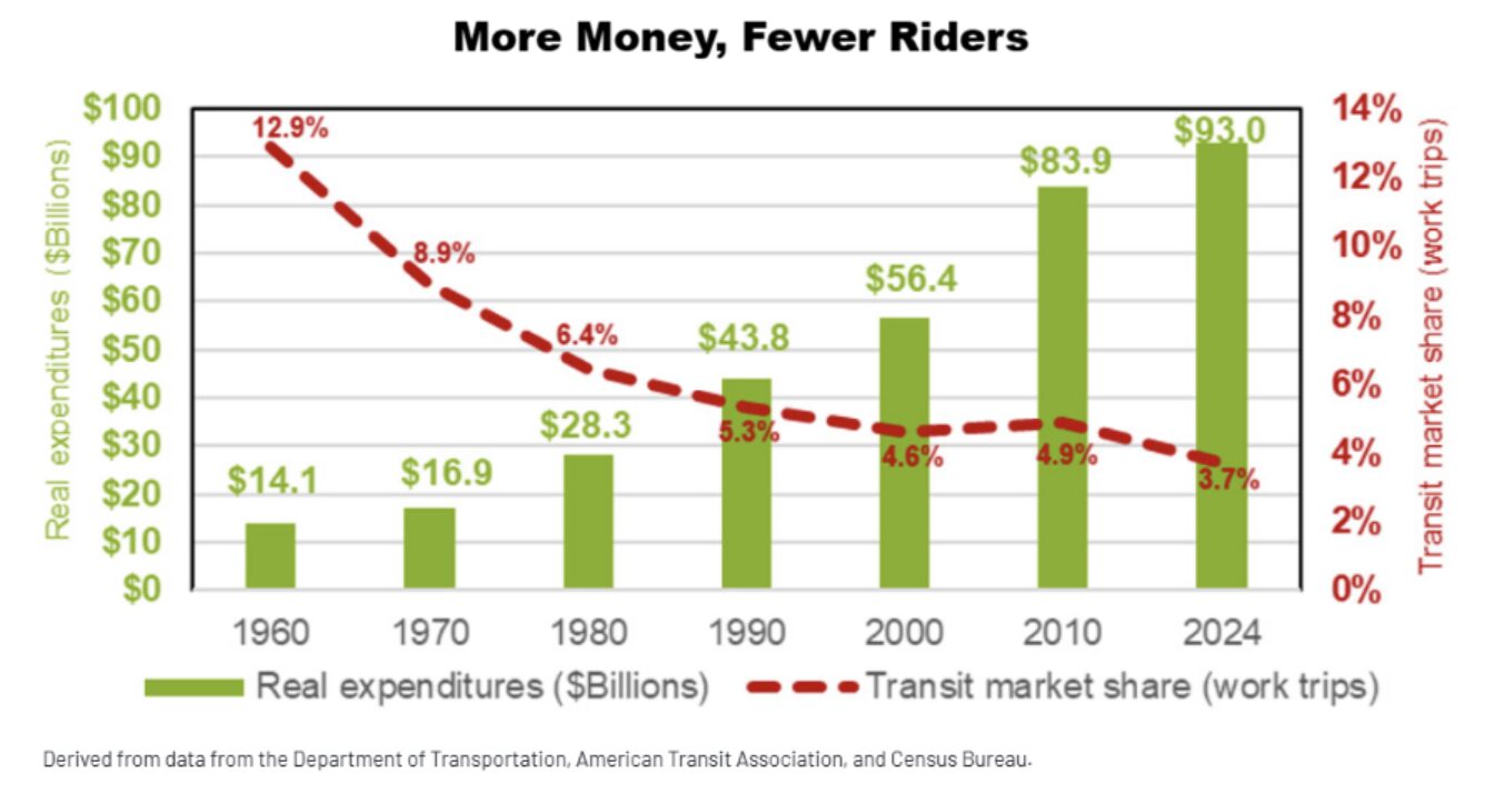 A new [Unleash Prosperity] report is raising fresh questions about whether billions in federal transit spending are delivering results, as funding climbs to record highs while bus and rail commuting remains below pre-pandemic levels…