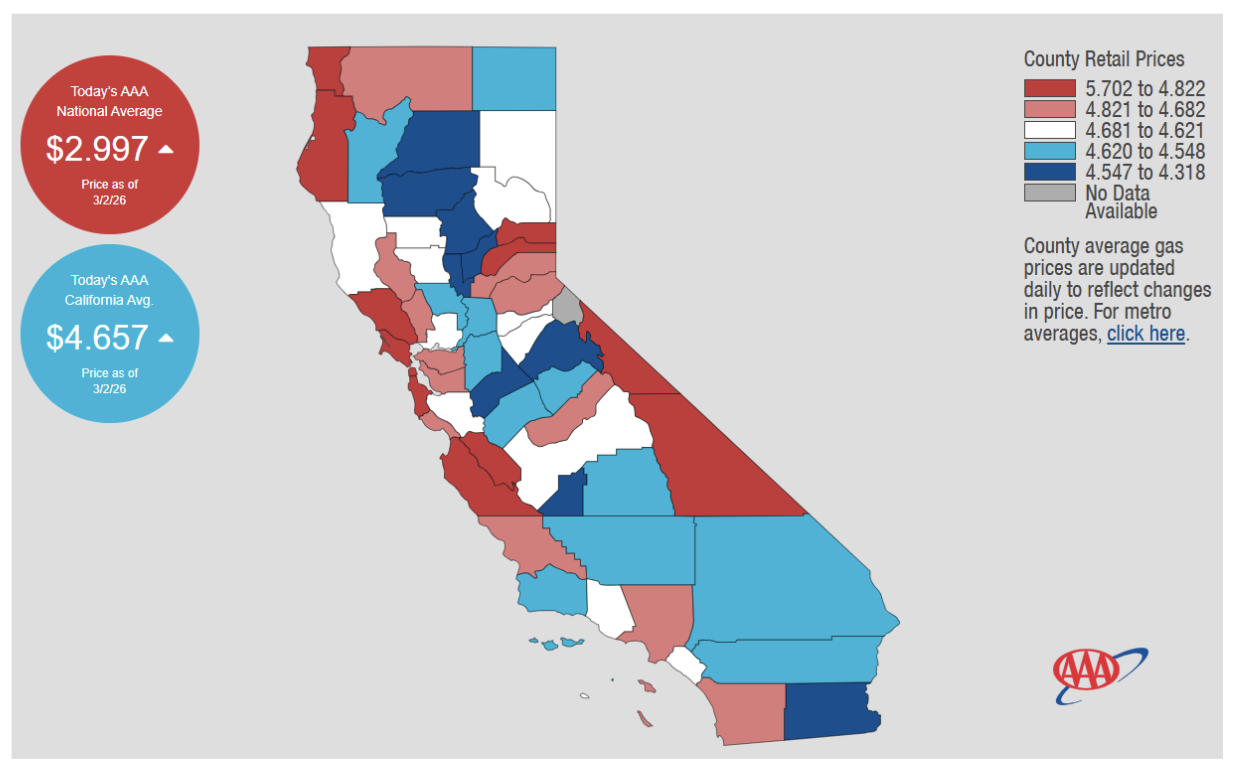 An average gallon of gas now costs $4.65, while the national average is $3.