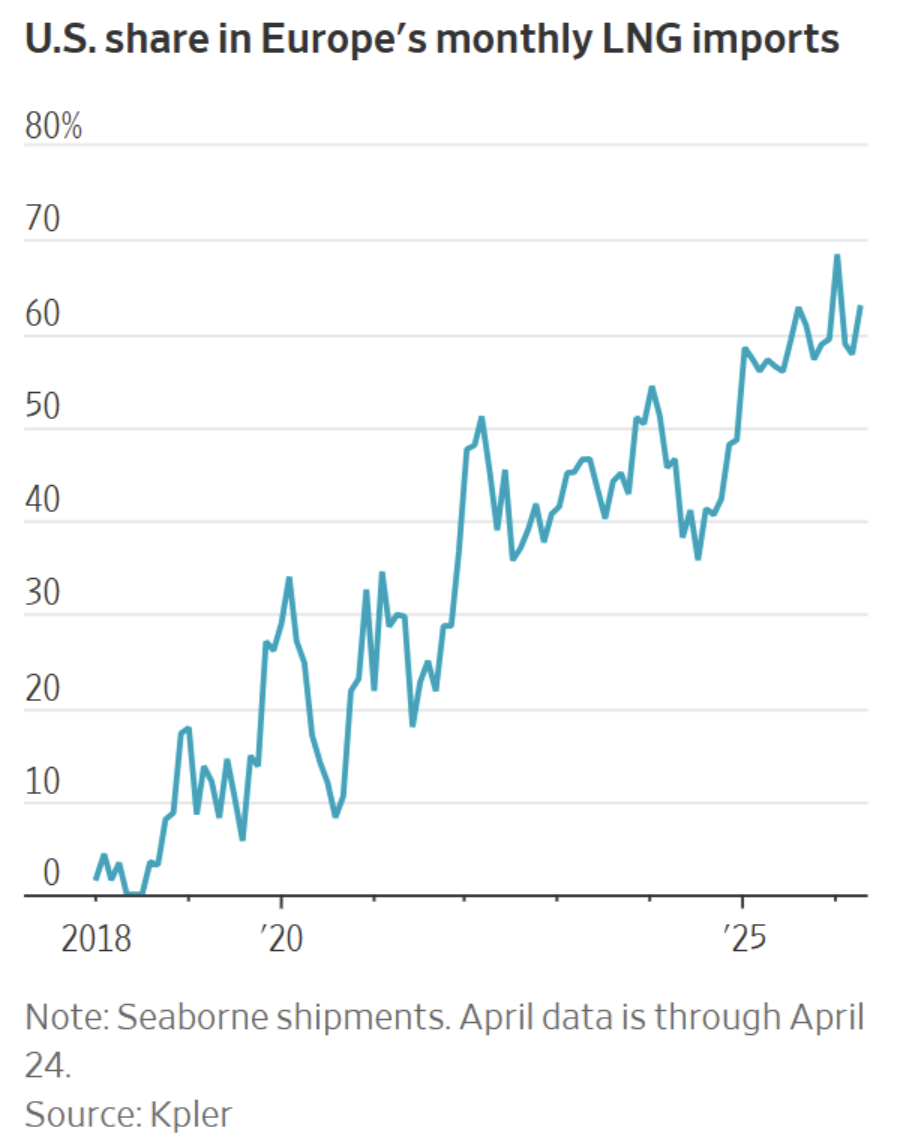 American exports of natural gas (LNG) have risen from 2% of all European imports 10 years ago to 62% today. We’ve largely and nearly completely replaced Russia as Europe’s energy source now that they’ve finally figured out that green energy doesn’t work.