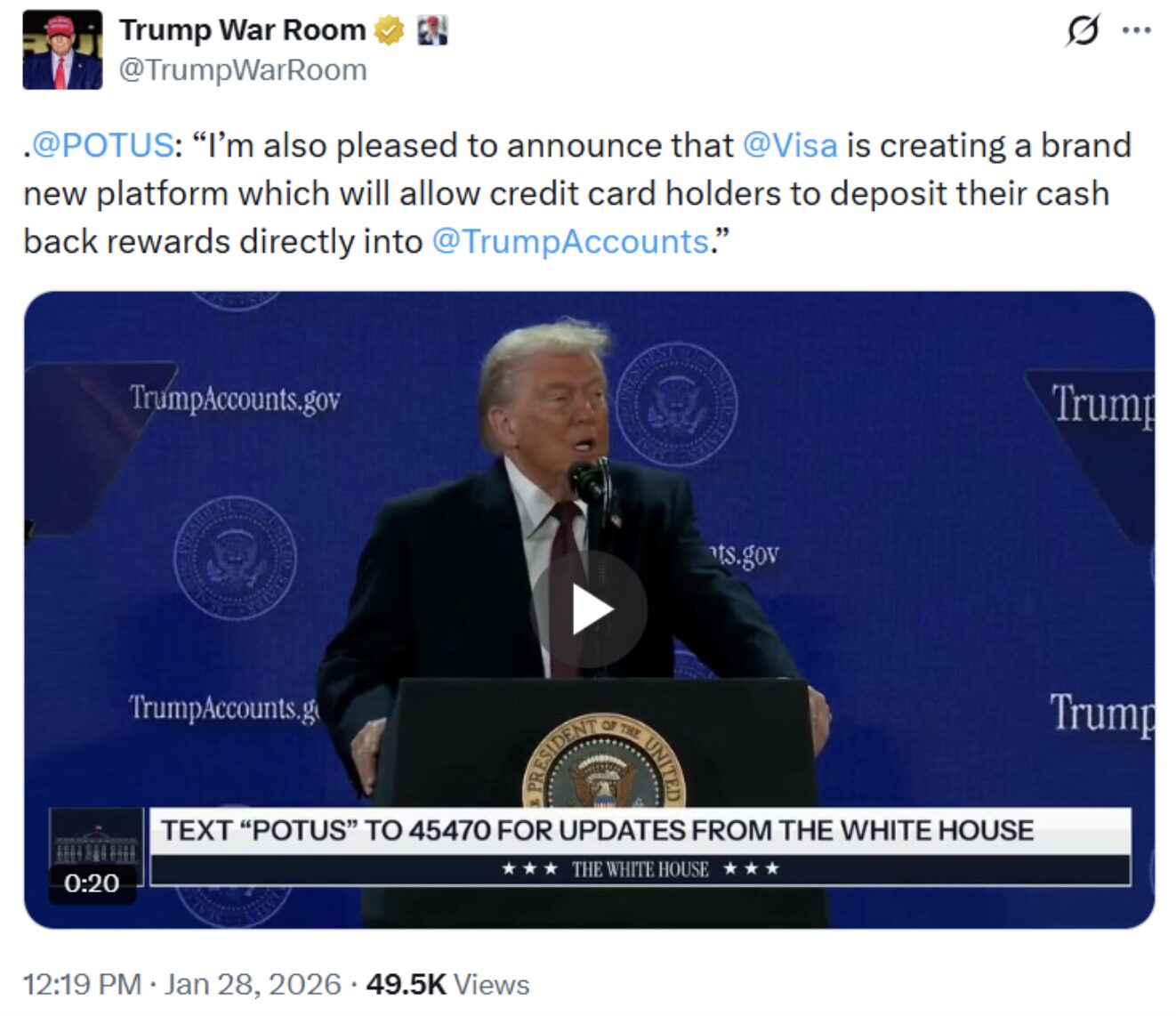 At the Trump Accounts Summit yesterday, which we attended, one of the highlights was the number of firms that pledged to deposit money into these accounts. Visa will launch new credit cards that issue cash back rewards directly to the designated Trump Accounts of eligible children. (We would warn the president that credit card price controls could imperil these rewards programs.