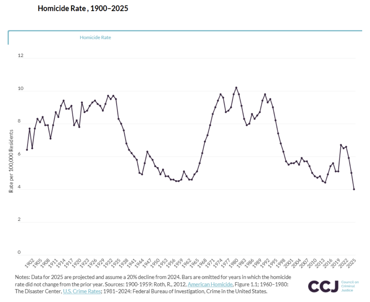 This chart from the Council on Criminal Justice shows that homicide rates reached an all-time low last year, dating back to 1900, if their projection is accurate.
