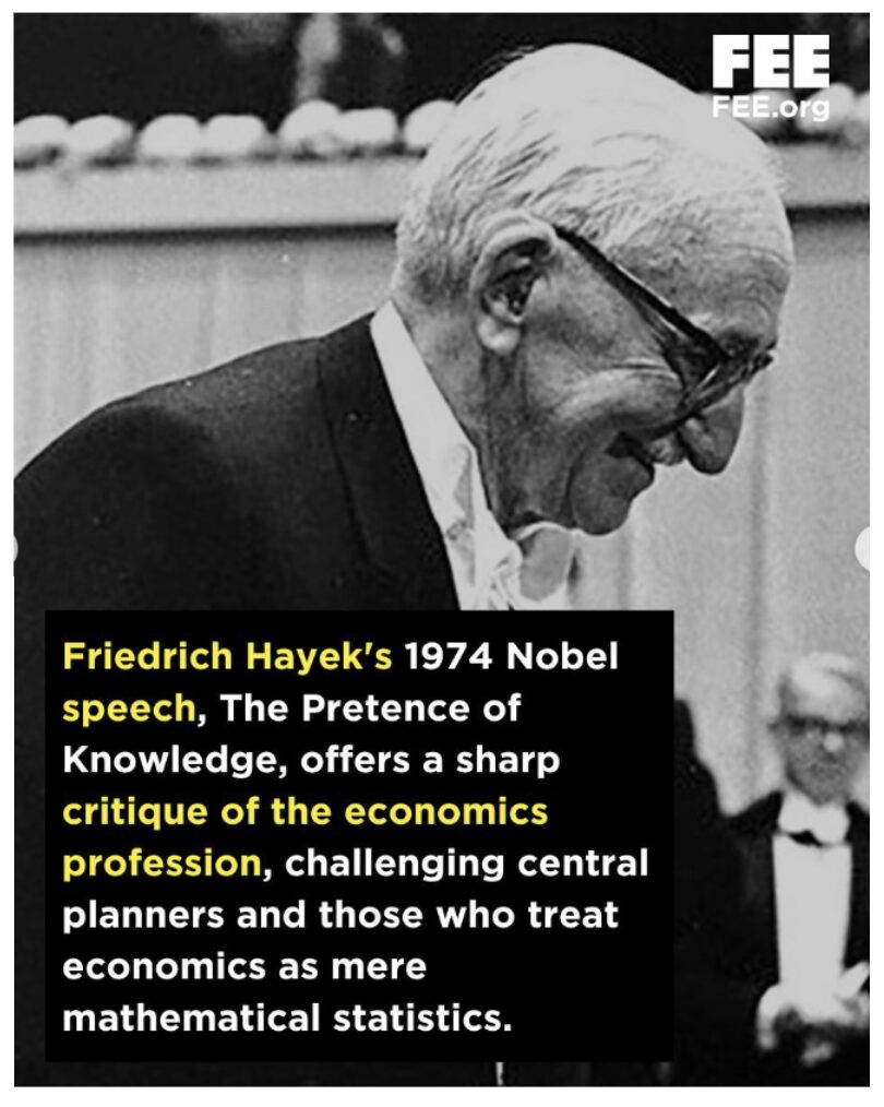 We love this statement by F.A. Hayek from his 1974 Nobel Prize acceptance speech: