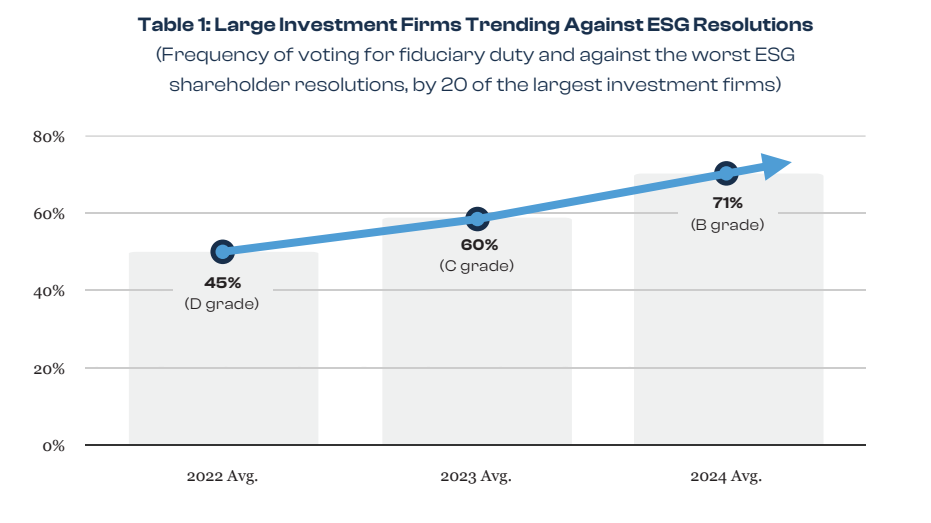 As you can see, one result of our report card on ESG is that the trend has been sharply down in terms of the big money management banks voting for climate change, racial and gender quotas in hiring, and anti-fossil fuel resolutions at shareholder meetings. Our goal for 2026 is to get firms voting 0% for political ESG measures, and 100% for maximizing shareholder returns.