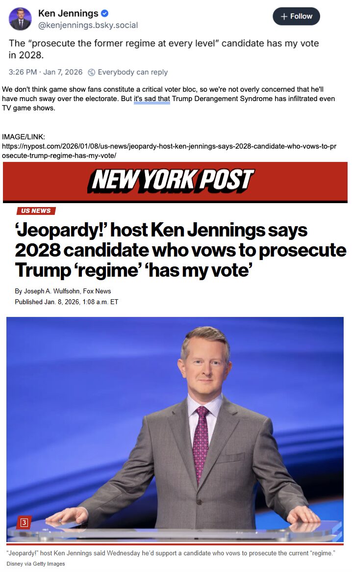 Ken Jennings, the former contestant promoted to host of television’s Jeopardy following the death of Alex Trebek, made the papers on Wednesday after posting this on the left-wing X-clone Blue Sky: