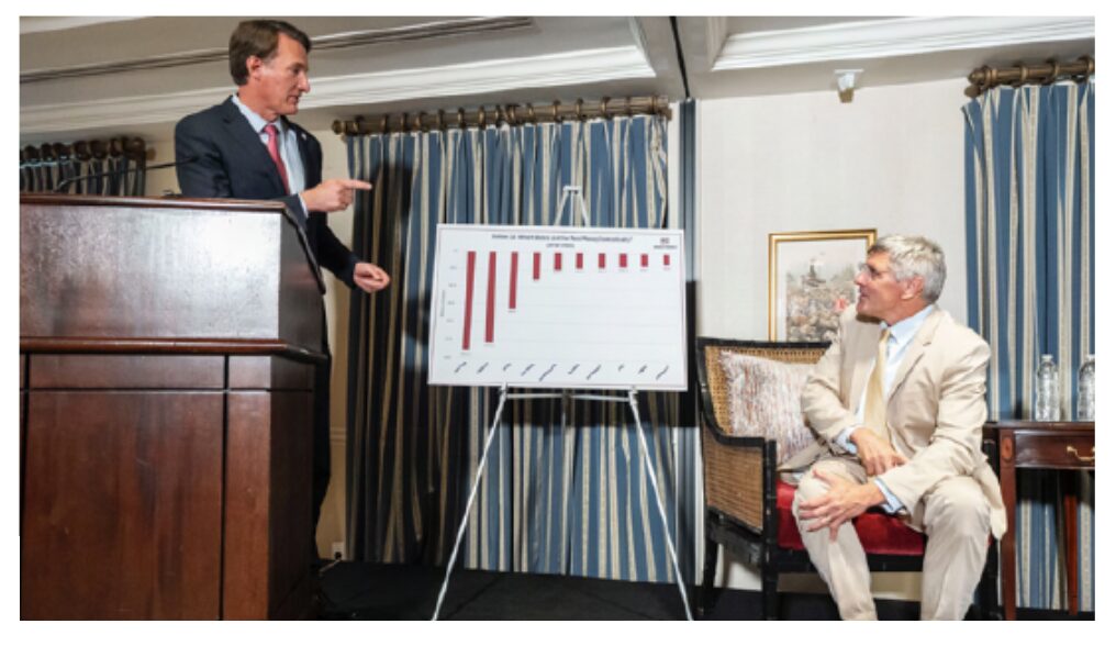 Virginia is a light blue state, whose pro-growth and pro-business tax and regulatory policies brought prosperity back to the Old Dominion state. In UP’s “Vote With Your Feet” report, Virginia turned around a decline. Youngkin told a UP gathering last summer that “for the first time in 10 years, more people moved to Virginia than moved away to the other 49 states, Common sense works.”