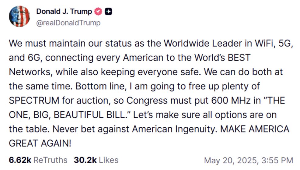 An unheralded feature of the Big Beautiful Tax Cut bill was authorizing the FCC to raise $88 billion through electromagnetic spectrum auctions. The money is to be used to reduce the deficit. We’ve been advocating for this for a long time.