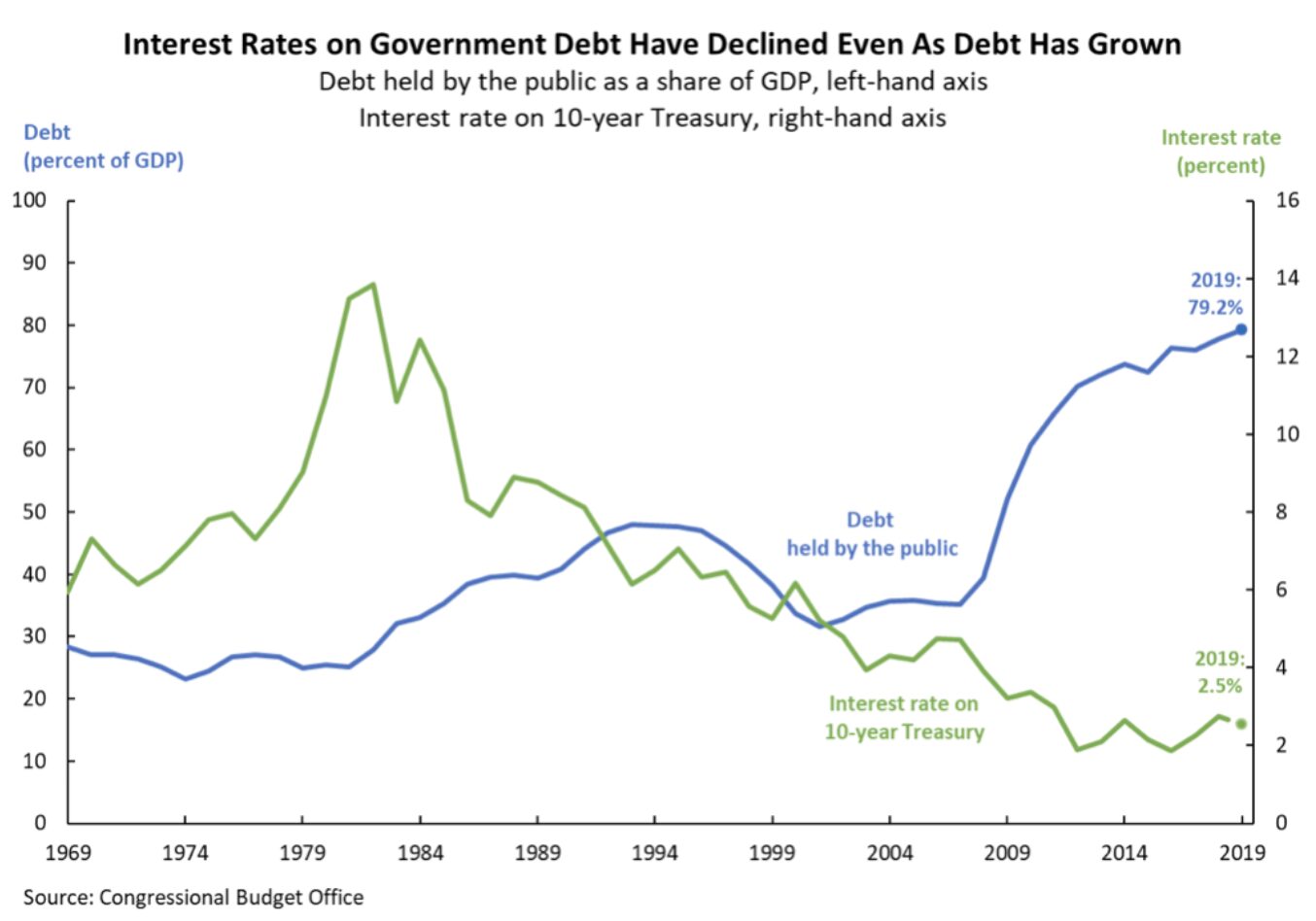 Government budget deficits are bad things and we’d love to see the budget balanced. But one of the lessons we learned in the 1980s was that government deficits do NOT cause higher inflation or higher interest rates. The deficits went up and yet the interest rates and inflation came WAY down.