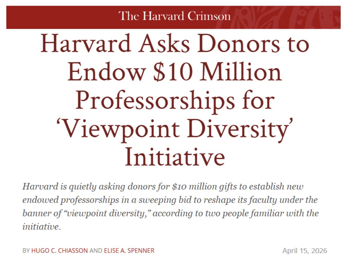 Amazing story: a University with more than $50 billion in the bank – enough to offer free tuition from now and forever needs to raise $10 million to promote some conservative views. We certainly hope no conservative donors are dumb enough to donate to this scam. They can’t spend a few crumbs – roughly 0.05% of their $50 billion – to foster alternative viewpoints!?