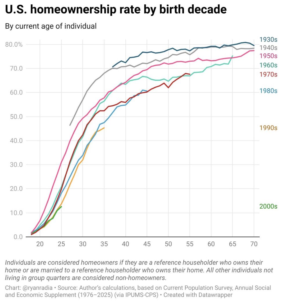 Here’s a fascinating chart from Ryan Radia showing that homeownership by decade has reached a new all-time low – though only narrowly, as the under-25 cohort is roughly in line with where the previous group was ten years ago. That is, however, down sharply from a few decades earlier.