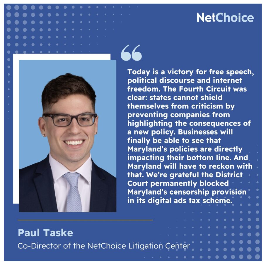 Congratulations to our friends at NetChoice for their significant victory in court last week, which blocked a provision of Maryland’s online advertising law that prohibited companies from disclosing the tax at the point of sale.