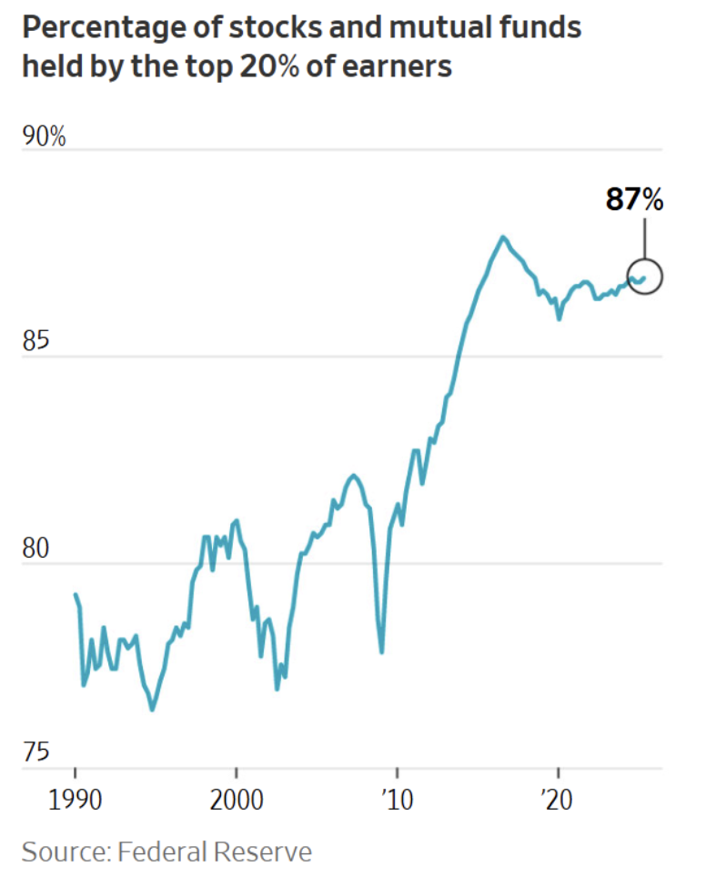 The WSJ noted yesterday that the wealthiest 20% of Americans own 87% of the stock. That’s a number that has drifted up from 76% 30 years ago.