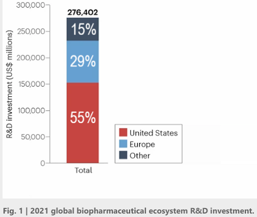 Sally Pipes of the Pacific Research Institute has done a terrific analysis: “the U.S. has swooped in to dominate the field.” She cites a Nature Reviews study that finds roughly 55% of the $276 billion of global pharmaceutical research and development investment in 2021 was by companies headquartered in the United States, compared with just 29% to Europe: