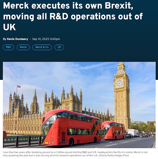 You may have seen that Merck has announced that it will cancel a proposed $1.3 billion research center in London and terminate its pharmaceutical R&D projects in the U.K.