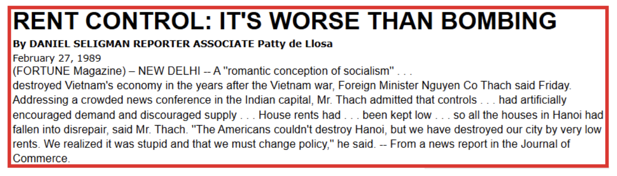 We would go one further and point out that in 1987, the Foreign Minister of Vietnam, Nguyen Co Thach, disagreed with Lindbeck’s famous quip. Nguyen said rent control was WORSE than bombing: