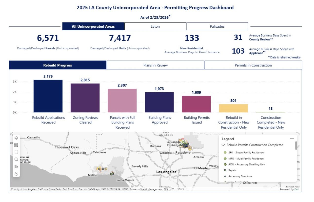 It has now been well over a year since fires ravaged homes in the Palisades and nearby areas of Los Angeles County, so we took a look at the county’s handy dashboard to see how much of the supposedly expedited recovery has taken place.