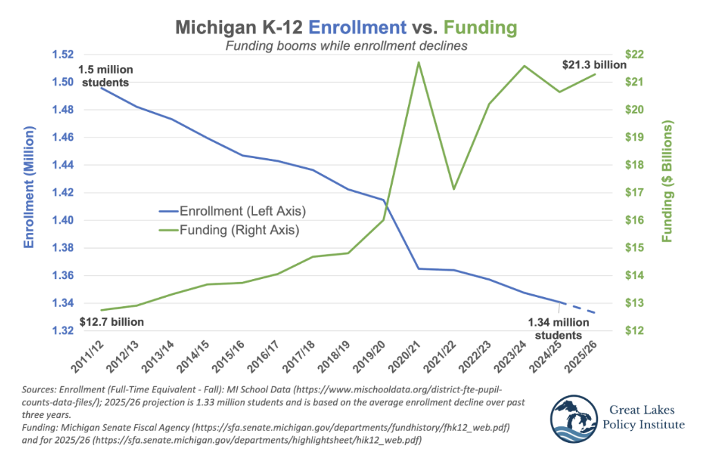 Our friend Jordan Bruneau at Great Lakes Policy Institute has found that Michigan schools are already flush with cash with the K-12 school budget rising from $12.7 billion to $21.3 billion between 2011-12 and 2025-26 – a 68% increase. The result? Test scores plummeted: