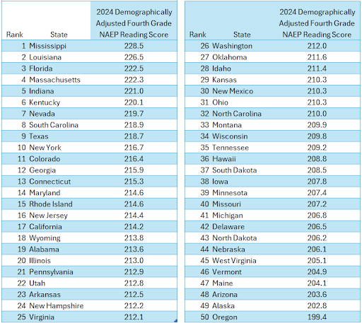These are the 2024 demographic-weighted (on the basis of race and income) 4th grade reading score rankings from the left-leaning Urban Institute: