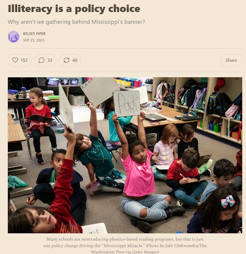 We’ve mentioned it before, but it bears repeating: Mississippi is now the number one state in the country for teaching low-income and minority kids to read. And Louisiana is number two, followed by Florida. This story is massively underreported because it’s embarrassing to the blue states that massively outspend them with nothing to show for it.