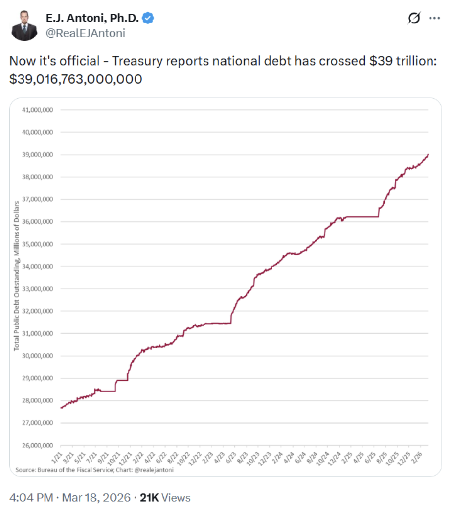 Maybe it’s time to cut spending before we hit $40 and then $50 trillion. The Iran war could add another trillion of red ink.