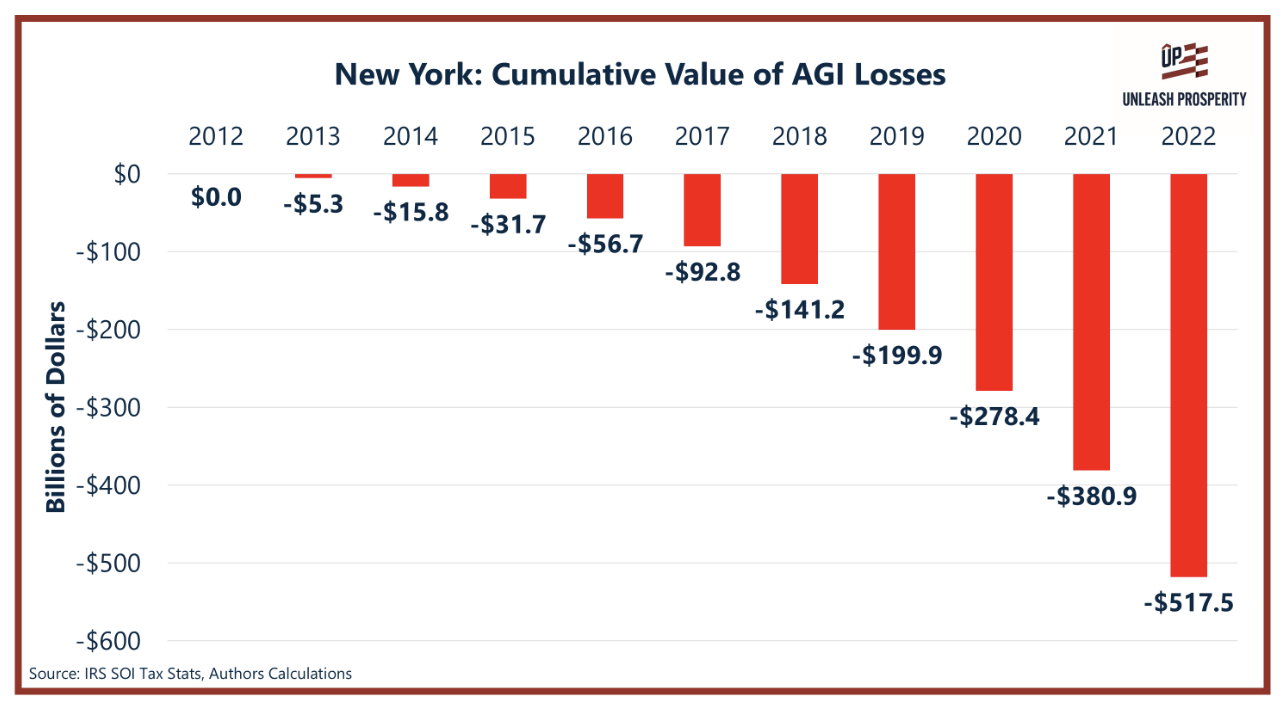 The figure below shows that personal income has poured out of these states to the tune of $700 billion cumulatively over the last decade, for which IRS personal income data is available.