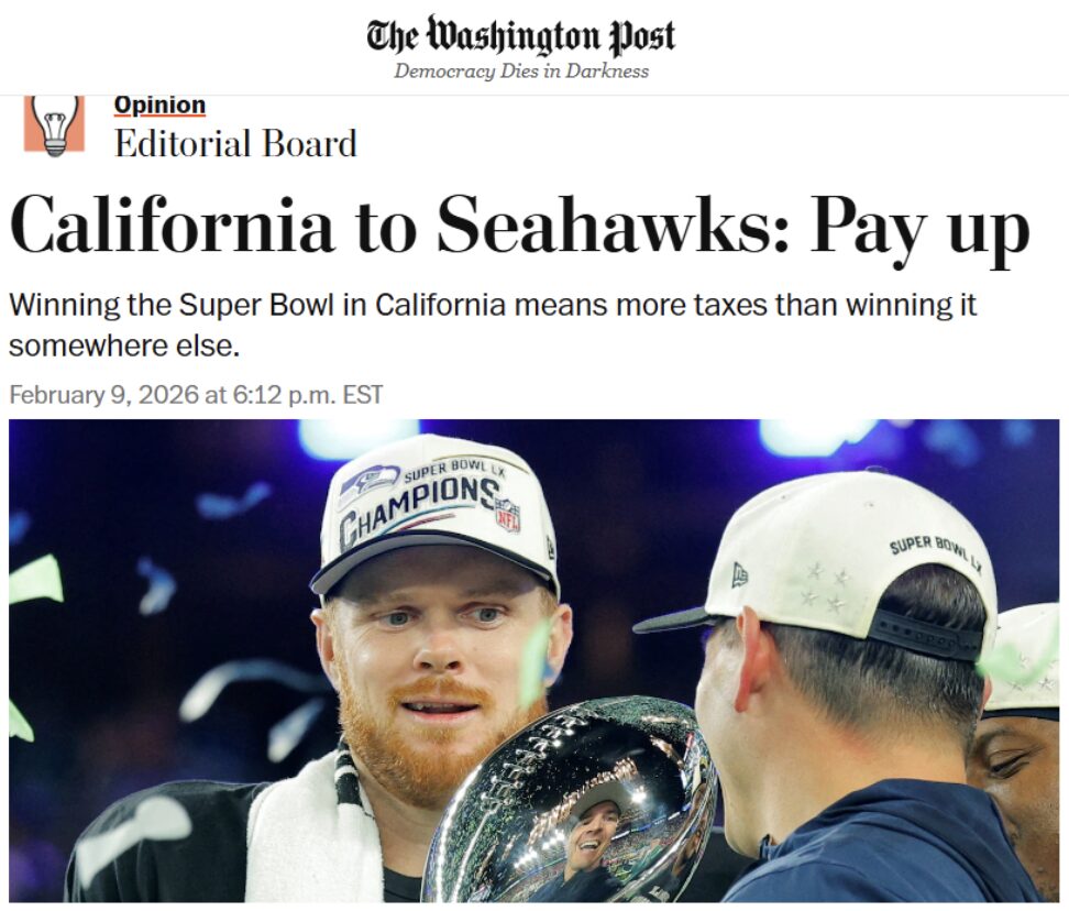 The Post also notes that the quarterback for the Seahawks, Sam Darnold, faces a California tax bill exceeding $200,000, which more than cancels out the $188,000 payment he (and every other member of the Seahawks) will receive from the NFL for being the winner.