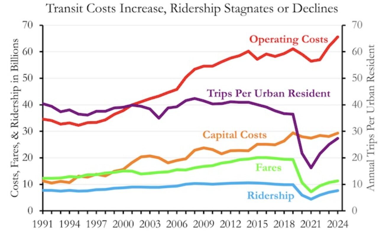 “Transit has not relieved congestion. It hasn’t reduced greenhouse gas emissions. It hasn’t helped many low-income people, the vast majority of whom have their own cars and don’t use transit. All this $1.8 trillion has done is enrich a few special interest groups….Transit advocates talk endlessly about the advantages of transit over driving. Americans are paying for it but they aren’t using it.”