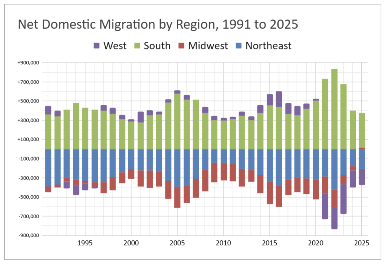 The Midwest as a region registered its first net increase in population from domestic migration we could find, going back to 1991. But just barely. The South is still booming. Nine of the 10 fastest growing states were in the Southeast and Southwest.