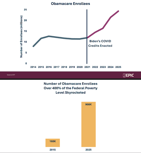 These two charts from EPIC show that since COVID was used as an excuse to eliminate caps and minimum premium payments, the number of Americans receiving Obamacare subsidies has doubled. The number of Americans with incomes at least four times the official poverty rate has quadrupled.