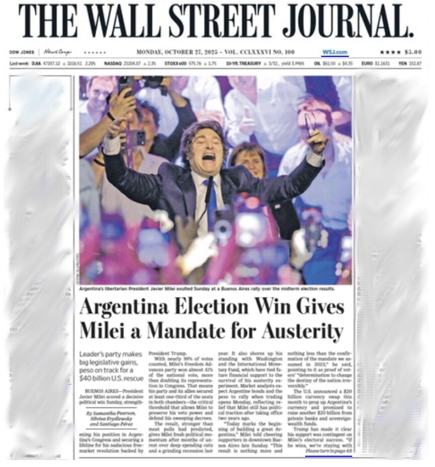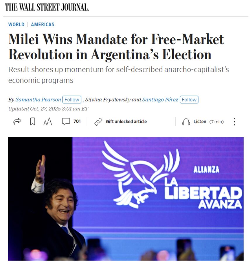 But Milei is delivering prosperity, not austerity, by cutting out-of-control government spending and needless bureaucracy and rules. Dollarization and tax rate cuts are also pro-growth, not pro-austerity. By the way, the BBC also led with this same fatuous spin on the election results from Buenos Aires.