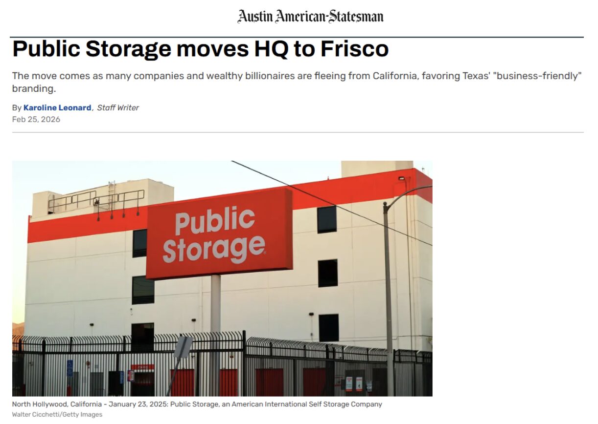 Public Storage said it is moving to take advantage of “the depth of talent and innovation” in the Frisco market. Never mind California’s high taxes, high gas prices, high housing prices, and underperforming schools.