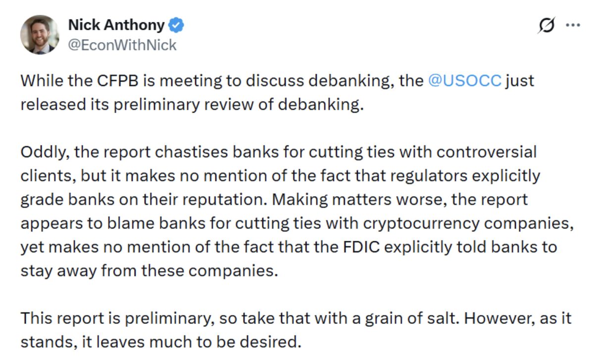 The Office of the Comptroller of the Currency released a preliminary report this week on debanking activities by the nation’s largest financial institutions. Yes, there