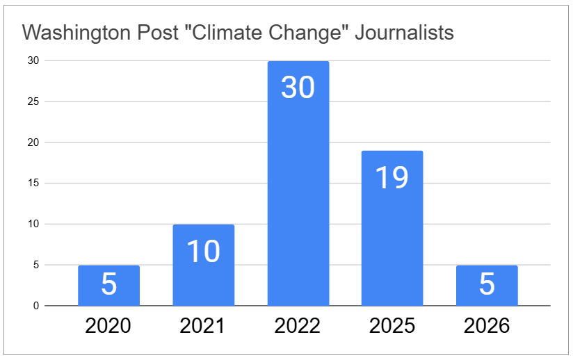 This week, the Washington Post laid off 14 of its remaining 19 climate change journalists: The Biden-era peak was in late 2022, when the Post announced that it “nearly