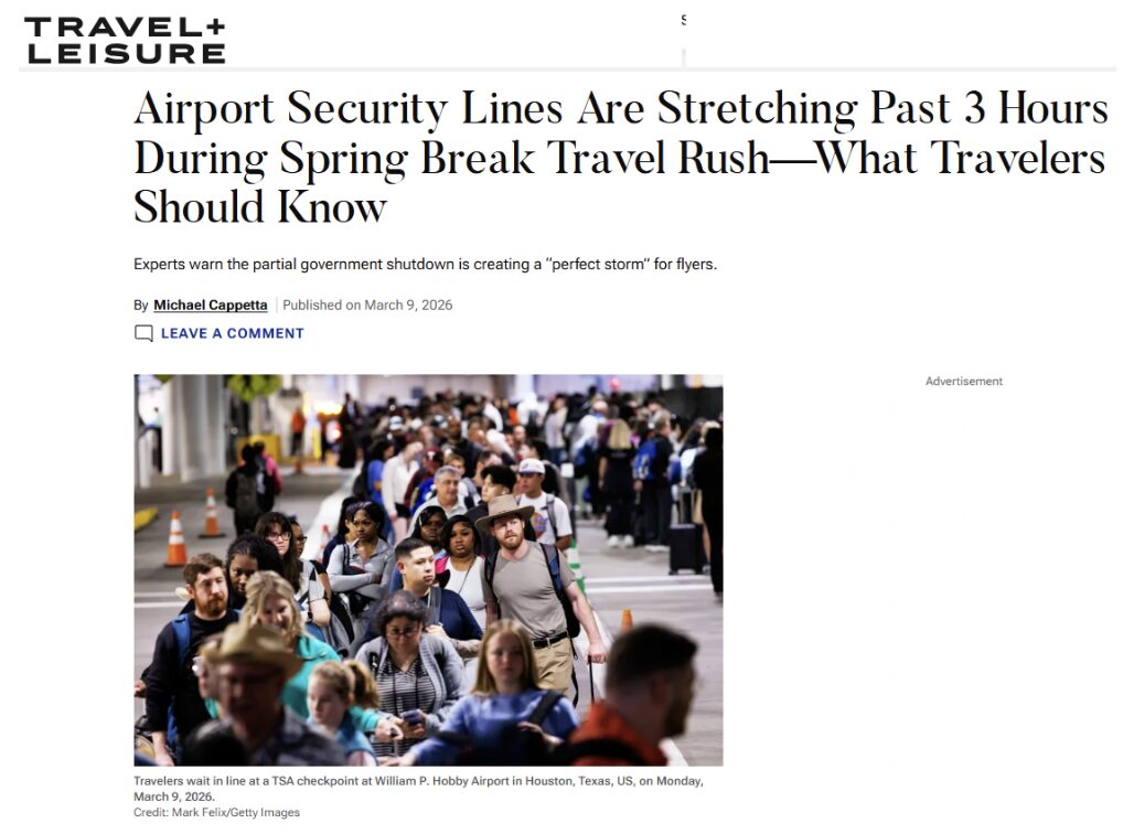 This Travel & Leisure magazine headline highlighting massive waiting lines three hours long to get through airport security caught our eye: