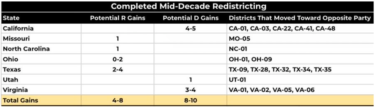 This chart shows Democrats are always better at politics than Republicans.  The Ds are likely to pick up a net 5 seats due to redrawing maps. (This doesn’t count the 4 seats they gained in the 2024 New York redraw.)