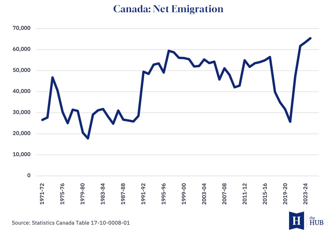 Canadian net emigration… reached 65,372 in 2024-25, the highest level in the 50-year data series…