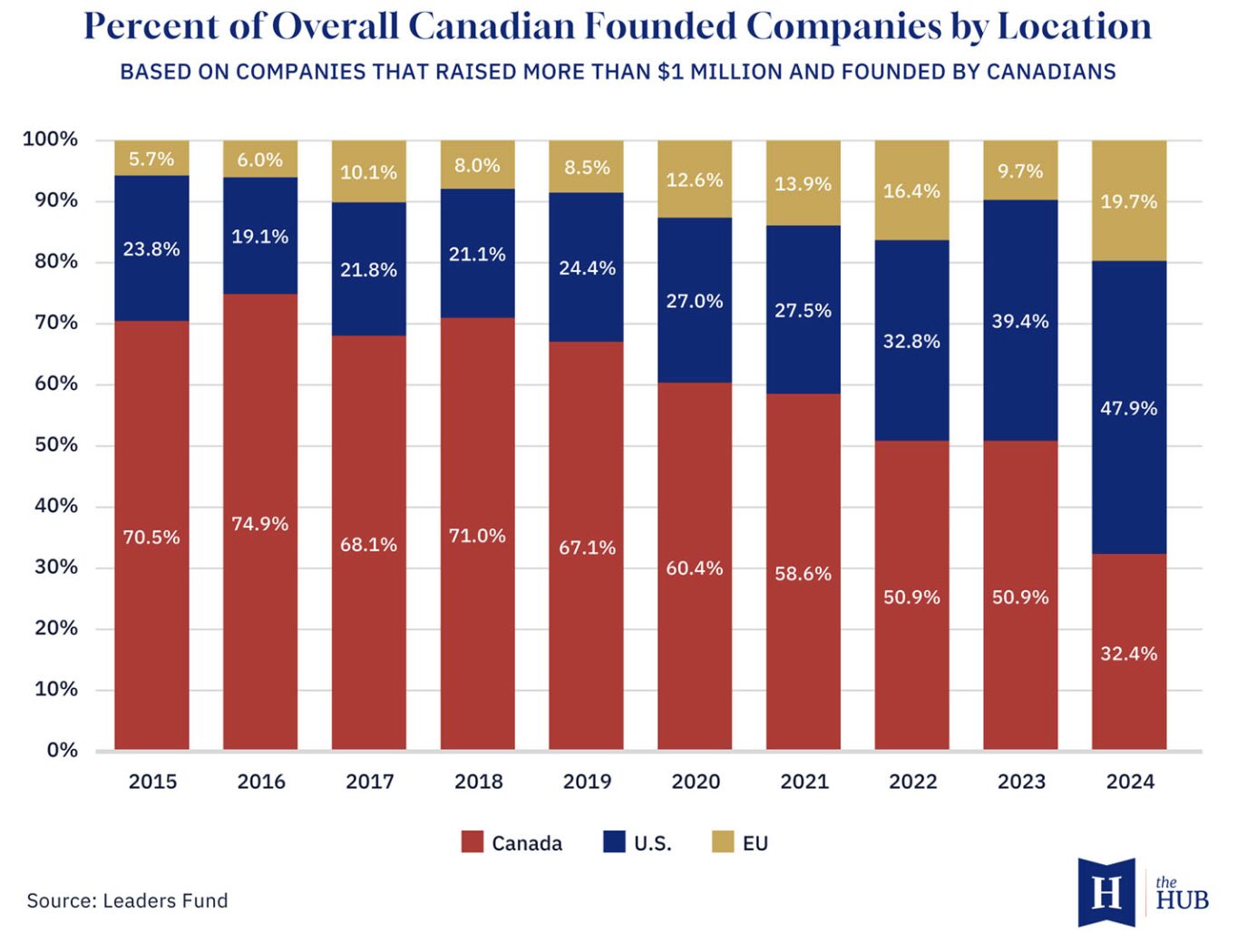 The pattern extends to entrepreneurship. Leaders Fund research analyzing nearly 3,000 venture-backed startups founded by Canadians between 2015 and 2024 found the U.S. went from producing 11 times more high-potential startups than Canada in 2015 to 45 times more in 2024. Nearly half of Canadian founders who raised over $1 million in 2024 were based in the U.S., versus one-third based in Canada, and the U.S. share has steadily grown since 2018. Canadian founders operating south of the border raise nearly twice as much capital as those who stay.