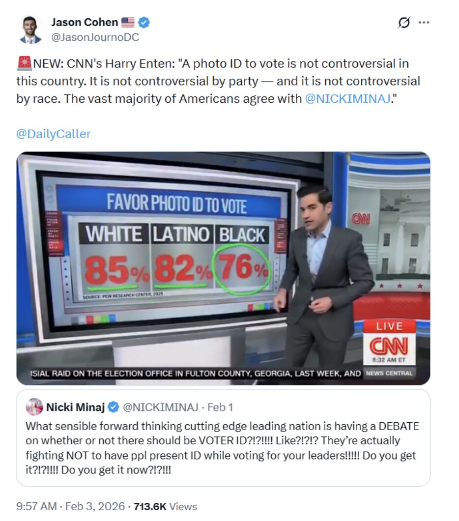 Harry Enten, a CNN data analyst, finds overwhelming support for requiring a photo ID to vote. In last year’s Pew Research poll it was backed by 71% of Democrats, 76% of blacks, and 82% of Latinos. When it comes to voter ID, Enten said the issue is a complete “nontraversy.”