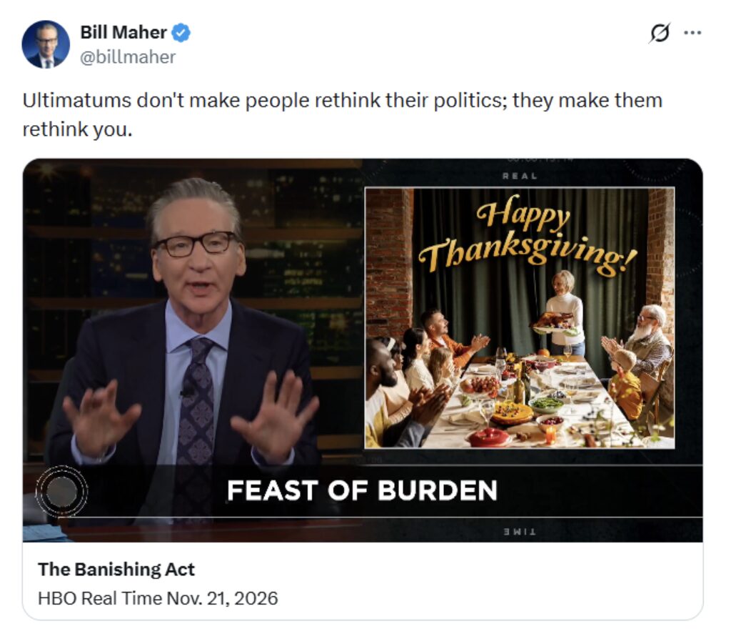Now, our friend Bill Maher of HBO – who’s no conservative – teed off on liberals who won’t sit at the Thanksgiving table with family members who voted for Trump.