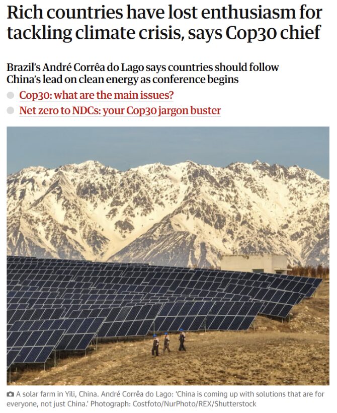 André Corrêa do Lago, the Brazilian diplomat running COP30, hails China for its cheap solar panels and EVs that are “low-carbon solutions for everyone.” Never mind that the Chinese are responsible for multiple times more air pollution than the next five biggest emitters! President Xi is filled with good intentions. Really!